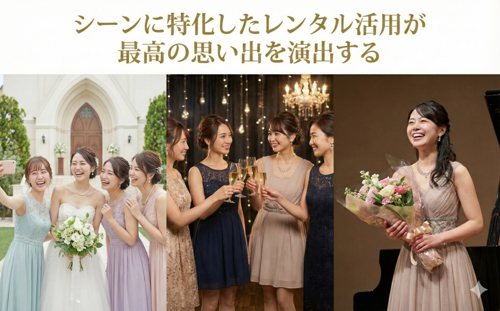 レンタルサービスを利用する際、最も重要なのは「その場にふさわしい一着」を選ぶことです。どれほど素敵なドレスでも、着用シーン(TPO)と合っていなければ、マナー違反になったり、周囲から浮いてしまったりする可能性があります。本記事では、結婚式、パーティー、発表会という代表的な3つのシーンに焦点を当て、失敗しないドレス選びのポイントを具体的に解説します。