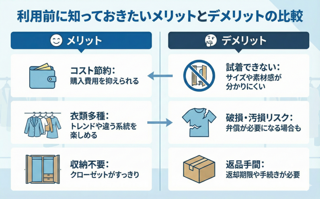 便利なサービスであることは間違いありませんが、購入する場合と比較して全ての面で優れているわけではありません。賢く利用するためには、良い面(メリット)だけでなく、注意すべき点(デメリット)も正しく理解しておく必要があります。